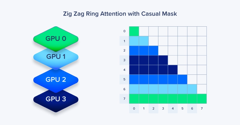 在 GPT 等自回归模型中,Token 仅需关注前文 Token 而非后续 Token,这会导致负载不均衡 —— 部分 GPU 出现闲置。之字形环形注意力通过 “交错式” 序列拆分替代 “顺序式” 块拆分,解决了这一问题:GPU 0 处理 Token [0, 4, 8...],GPU 1 处理 [1, 5, 9...],以此类推。这种方式确保每台 GPU 均能均衡分配早期与晚期 Token,在因果注意力计算中实现 GPU 负载均衡,避免环形拓扑中的设备闲置。