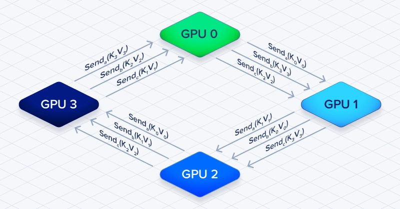 - 将本地 K、V 张量传递给环形拓扑中的下一台 GPU;