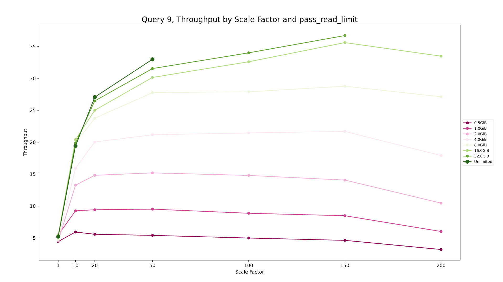 图 2.针对 Query 9 的不同规模因素按块大小 (pass_read_limit) 进行吞吐量比较