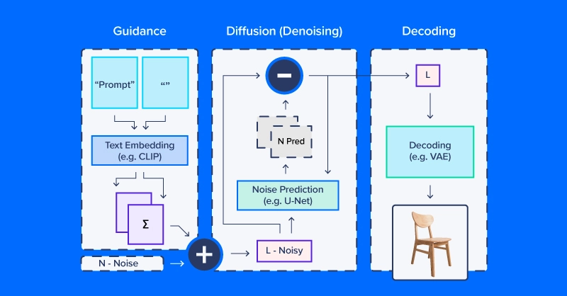 从事潜在扩散研究的人经常谈论使用“扩散模型”,但事实上,扩散过程采用了几个模块。如上图所示,文本到图像工作流的扩散管道通常包括文本嵌入模型(及其标记器)、去噪预测/扩散模型和图像解码器。潜在扩散的另一个重要部分是调度器,它决定了如何在一系列“时间步长”内缩放和更新噪声(一系列迭代更新,逐渐从潜在空间中去除噪声)。