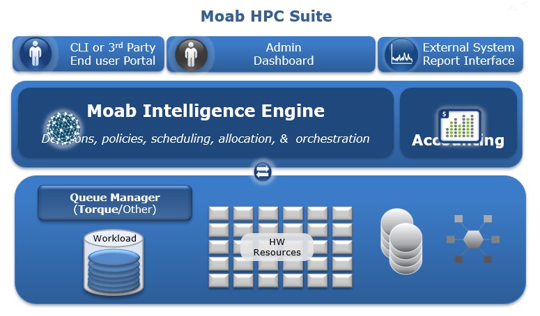 Adaptive Computing 的 Moab HPC Suite 是一个工作负载和资源编排平台,可大规模自动调度、管理、监控和报告HPC工作负载。其获得专利的智能引擎使用多维策略和先进的未来建模来优化不同资源的工作负载启动和运行时间。